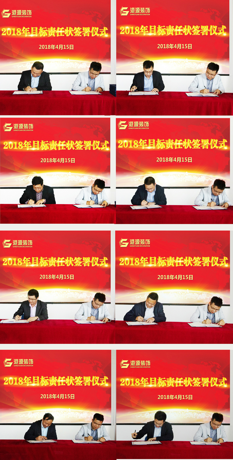 為全面落實(shí)公司年度戰略目標,強化績(jì)效和激勵機制,4月15日,港源裝飾各運營(yíng)分公司在會(huì )議上簽署了2018年度目標責任狀,并明確地將年度目標層層下達,使“年初有計劃、年底有考核”的閉環(huán)管理模式真正實(shí)現落地!