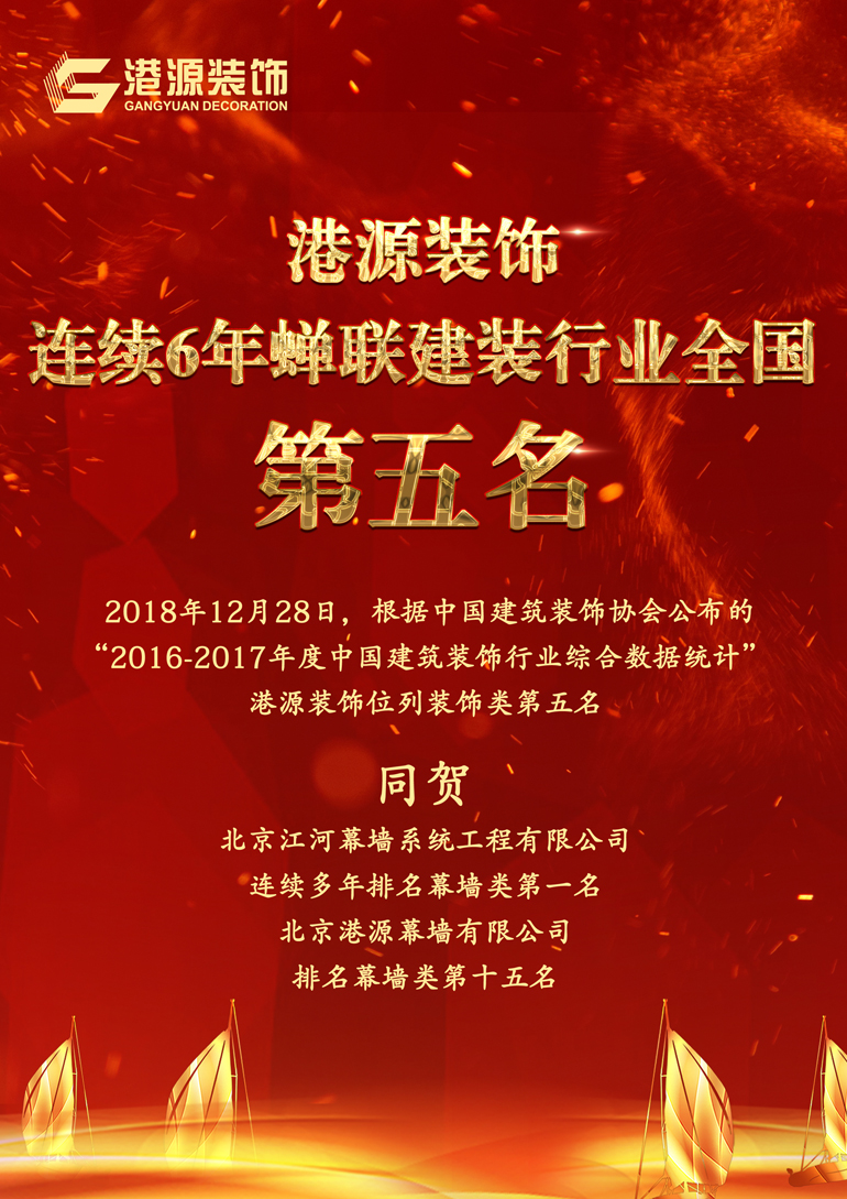 港源裝飾連續六年蟬聯(lián)建裝行業(yè)全國第五名