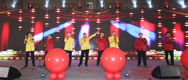 在歌曲串燒《燃燒吧2019》中的最后一首曲目——《歌唱祖國》中,符劍平總帶領(lǐng)全體高管上臺,掀起了全場(chǎng)大合唱。歌曲的最后,在“2019,勢不可擋”的高呼聲中,“聚勢而上,敢為共行”2019港源裝飾年會(huì )圓滿(mǎn)閉幕!