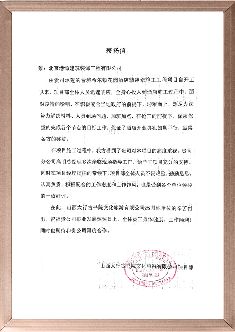 2022年9月,希爾頓集團宣布晉城古書(shū)院希爾頓花園酒店正式營(yíng)業(yè)。山西希爾頓花園酒店是山西華誼兄弟星劇場(chǎng)的配套項目,是山西省第一家希爾頓集團酒店。項目由晉城古書(shū)院文化旅游有限公司投資興建,由希爾頓集團運營(yíng)管理,室內全部區域的精裝修工程由港源裝飾負責施工。